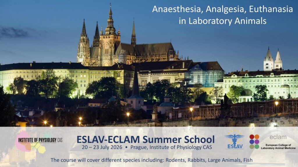 The 2026 ESLAV-ECLAM Summer School “Anesthesia, Analgesia, Euthanasia, in Laboratory Animals” will take place in the vibrant City of Prague, Czech Republic during 20-23 July 2026, at the Institute of Physiology of Czech Academy of Science.
