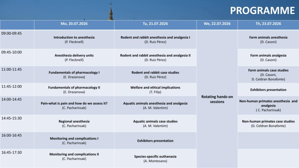 Join us for up-to-date lectures in Anesthesia, Analgesia and Euthanasia and one day rotating hands-on sessions!
